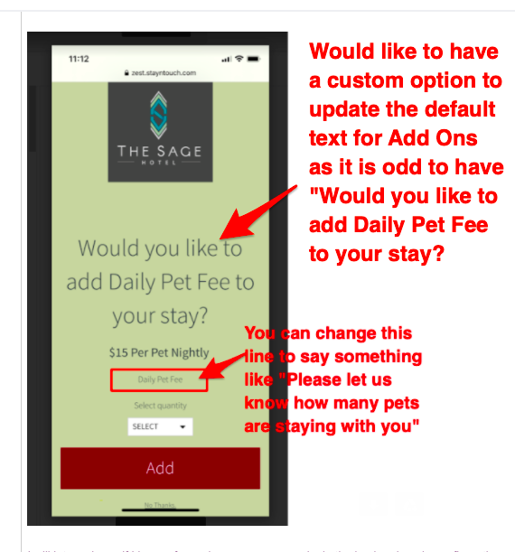 The Sage Inn has a Pet Fee that they are presenting as an Add On during the Zest Web Check In. The current verbiage default presents itself as "Would you like to add Daily Pet Fee to your stay?" The property would rather have the text read" "Are you bringing any pets?"