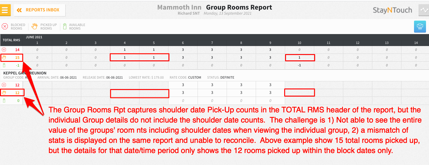 We would like both the Group Rooms Report and the Group Pick-Up Report to at least have the option to select to include shoulder dates statistics. The Group Rooms report includes the shoulder date room count in the total section of the report, but does not include the shoulder counts at the group level when viewing the report, so it is kind of a mystery as to where the "extra" room counts come from when there are multiple groups In House. In the example below it is easy to see as I only had one group in house over the date range of the report.