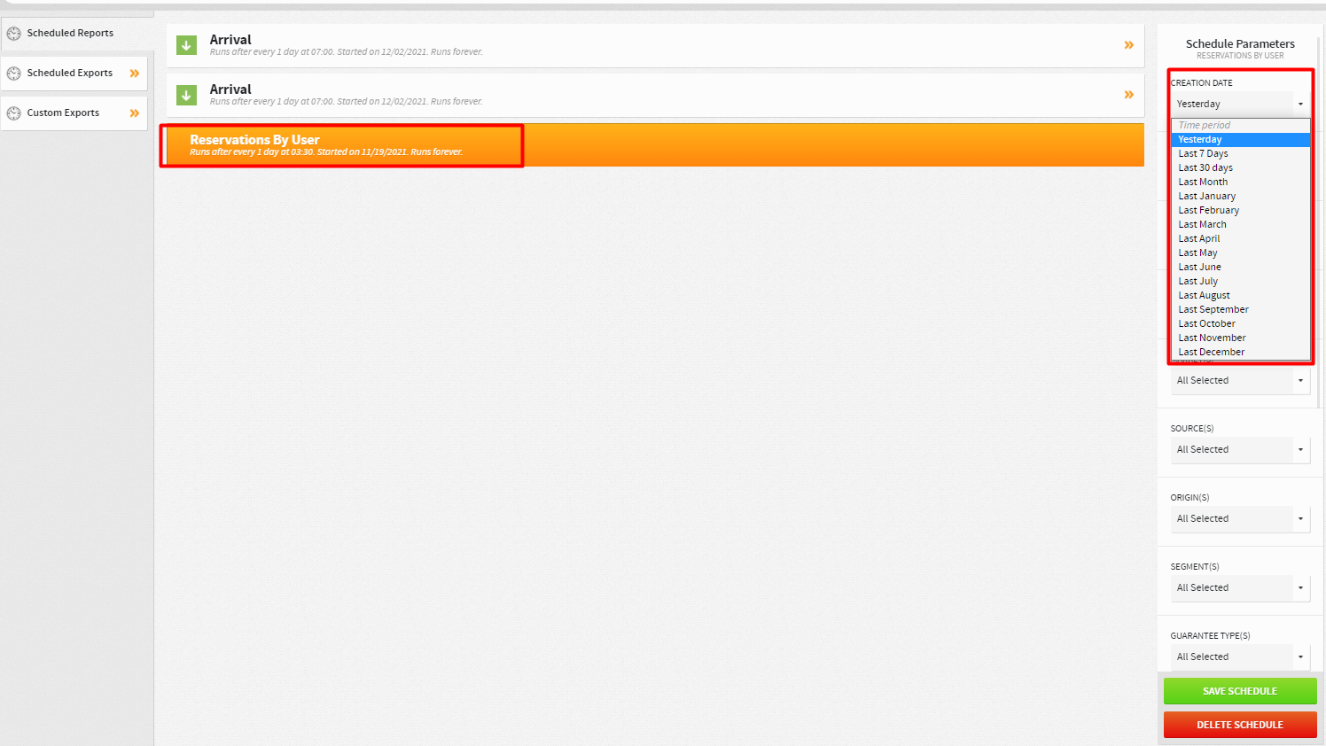 Please give us an "ALL" filter for Arrival and Create date on the Reservation by user report in the scheduler. We are able to run the report from the regular reports menu/inbox without date limitations.