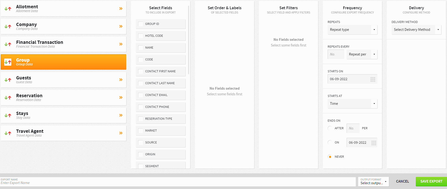 Current path to Group Data is Menu>Reports>Schedule a Report/Export>Custom Exports>+ NEW EXPORT>Group