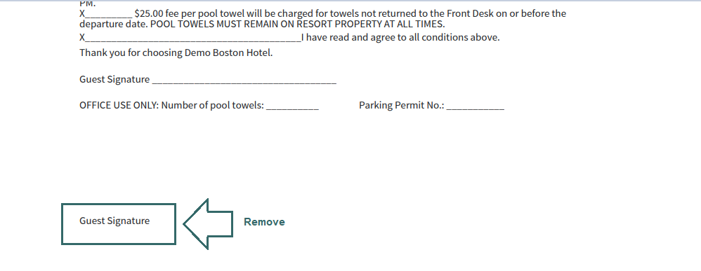 Some clients have also requested the removal of the 'Guest Signature' text that appears at the bottom of all registration cards by default. This way, they can place the Guest Signature within the Terms and Conditions text wherever they choose
