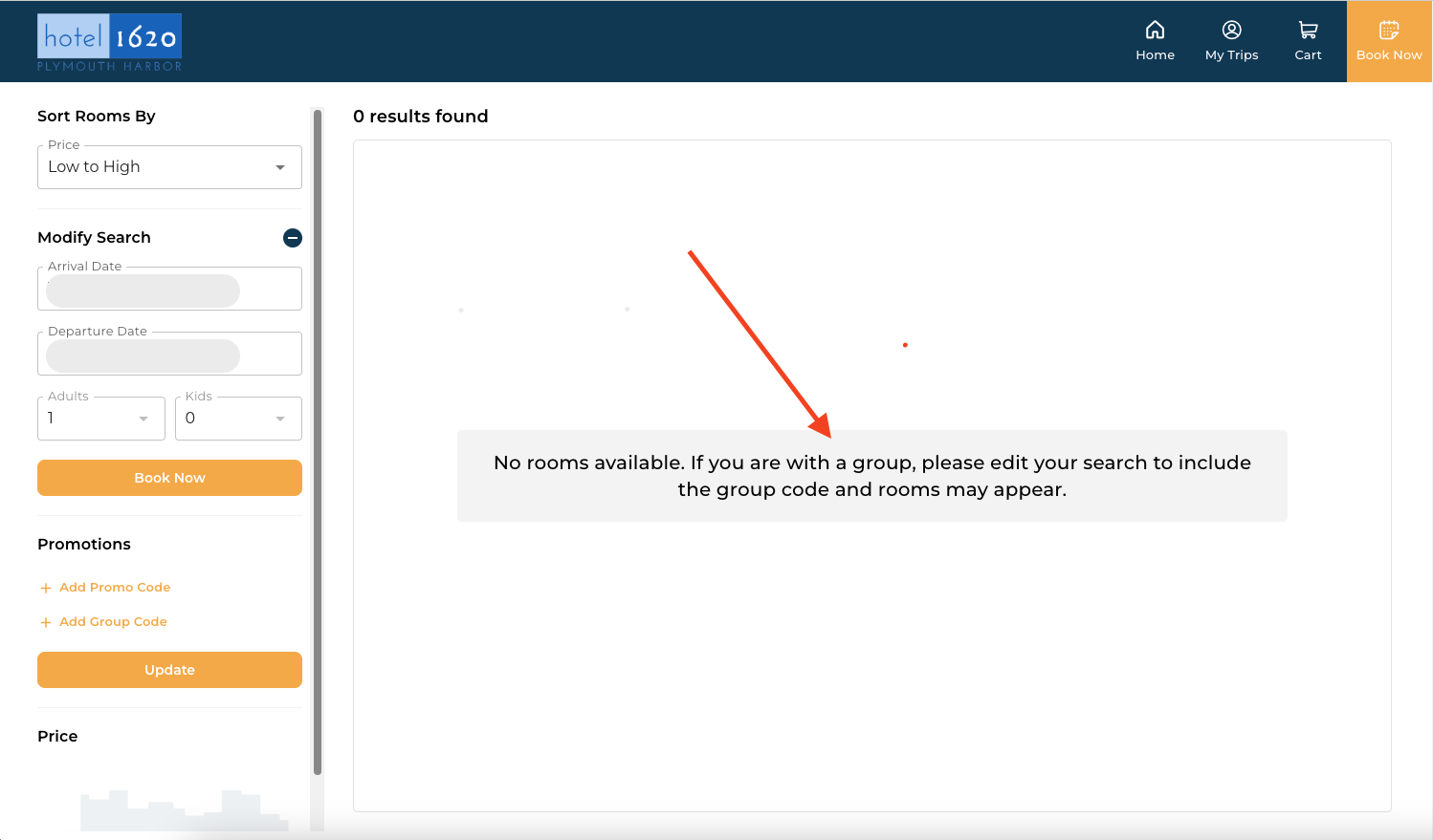 We are a group heavy hotel, and have company buy outs, when you go to book a date you put in the dates, its searches before being able to put in a group code, since its a group buy out it says " sold out" - Could we possible add a note that says " please enter group code" under the sold out or something that would direct people to try and use the group code if it says sold out? This is requested by Hotel 1620 Plymouth Harbor.