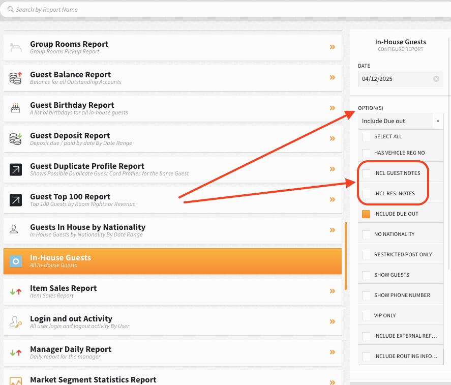 I'm going to mark this as completed because we already offer this - when running the In-House Guest Report, make sure to expand the Options dropdown and select "INCL GUEST NOTES" (guest card notes) and "INCL RES. NOTES" (reservation specific notes, or notes that are shared from an attached entity).