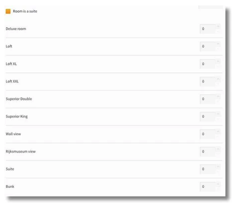 - The user may increase or decrease the number of rooms for this particular room type by selecting the arrows. The number of rooms added here for each specific room type are the base for the creation of the component/suite rooms.
