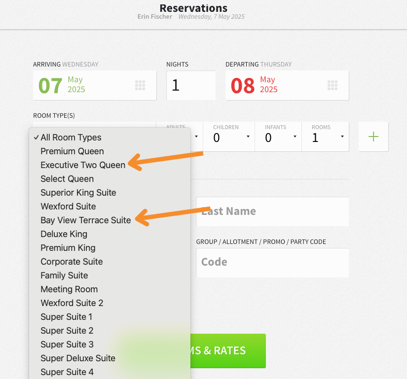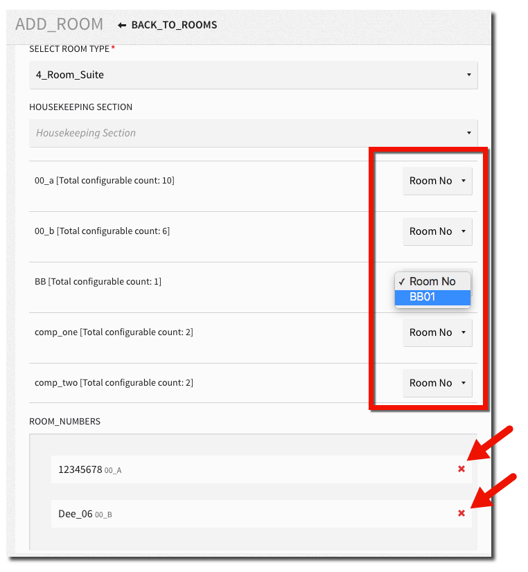 - You can select specific rooms (by room number) with the dropdown menu for each room type.