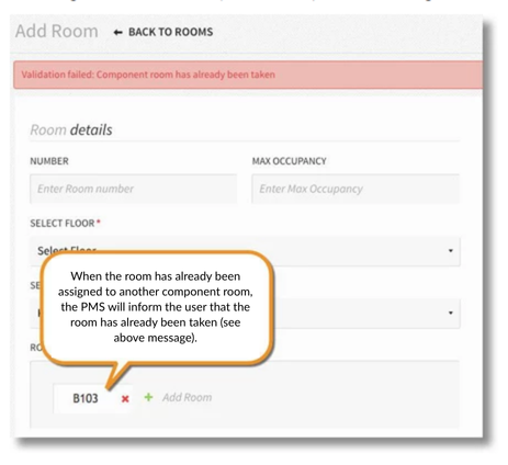 - Stayntouch PMS does not currently notify the user which room is already taken if there is more than one room listed. In the example below, since only 1 room (B103) is listed, it is easily identified as already assigned to another component room, resulting in the error in this screenshot.