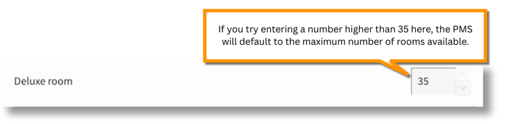 - Stayntouch PMS will not allow the user to exceed the total number of physical rooms for a room type. If the user attempts to exceed the number of rooms (say the user enters 100 when the hotel only has 35 rooms), Stayntouch PMS will default to the maximum number of rooms available when the user clicks outside the number box.