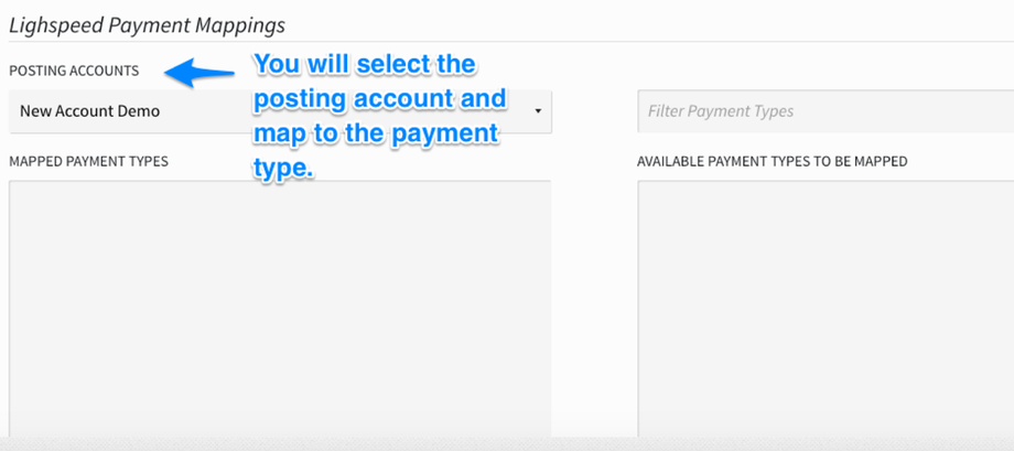 You now have the option to add payment mappings in the Lightspeed POS configuration. You will have a dropdown menu of all previous posting accounts created.