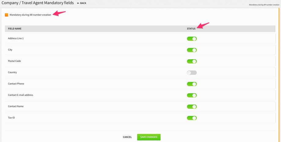 Each field will have a corresponding status toggle (YES: the field will be mandatory; NO: the field will not be mandatory). These fields are as follows: