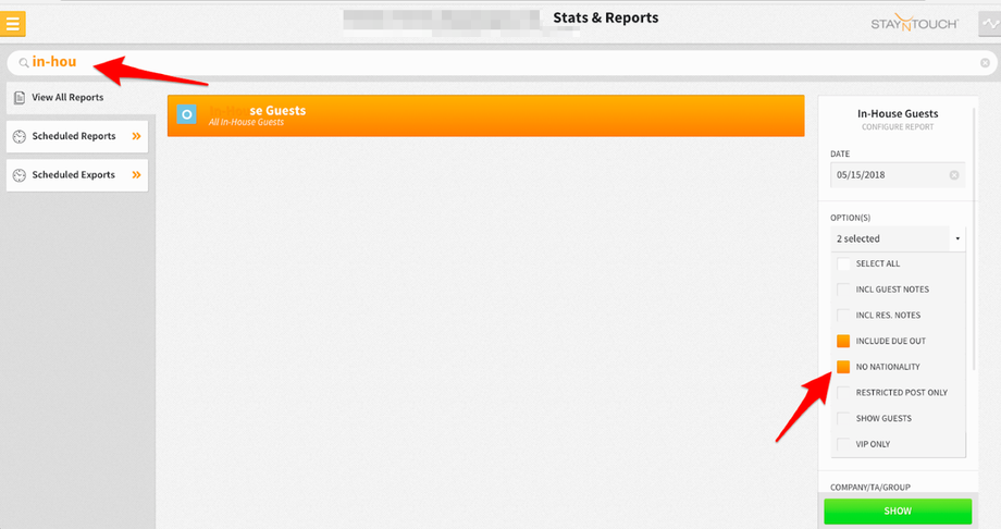 In order to not have too many undefined entries in the nationality reports required in some countries, reservations for guests with no nationality on the guest card need to be easily identifiable so users can add the nationality. To achieve this, add a filter to In-House report to show reservations with guests with no nationality only.