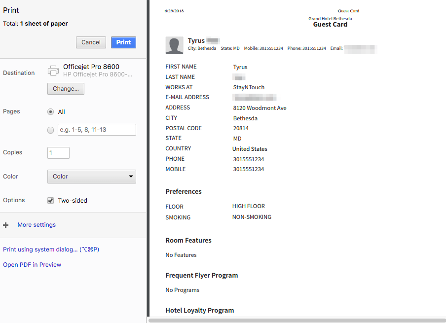 The registration card now displays the full primary guest address, including the guest’s country. The added fields include the following: