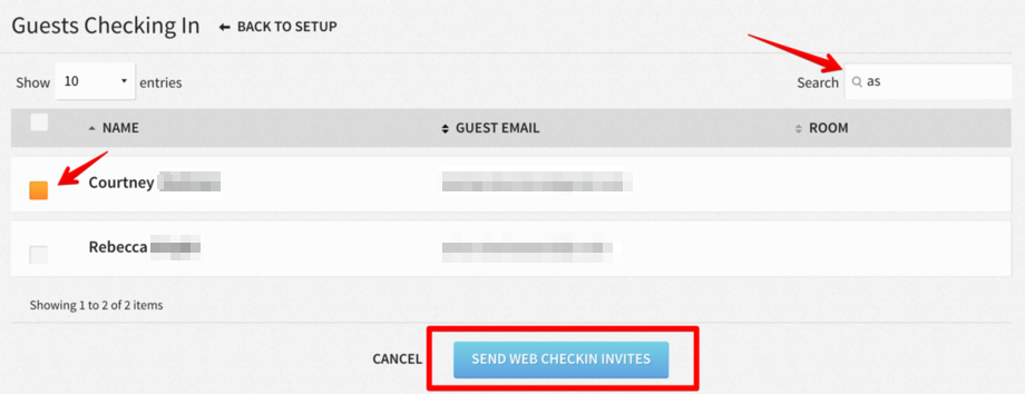 Upon selecting SEND CHECK-IN EMAIL, you will see a list of qualifying guests/hotel staff whom you can search and select to SEND WEB CHECK-IN INVITES.