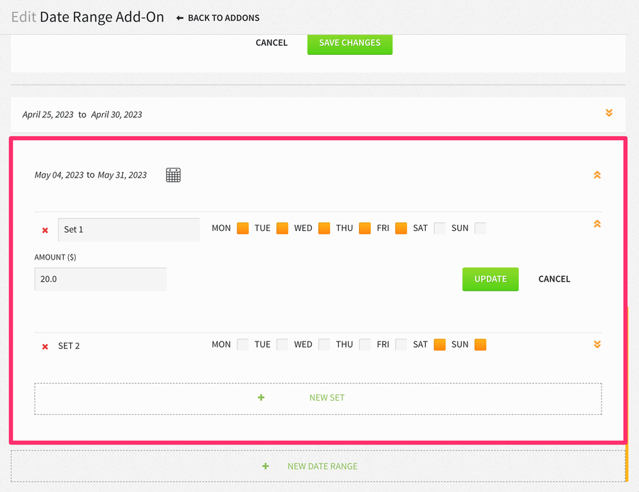 You can also create an add-on date range from Settings > Rates > Add-Ons > Select Add-On > + NEW DATE RANGE. This functionality works similarly to setting a date range for rates. Please note, the ENABLE ADD-ON DATE RANGE AND SETS toggle must be enabled from Settings > Rates > Rate & Add-On Settings for this option to become available. We recommend creating new add-ons utilizing the date range.