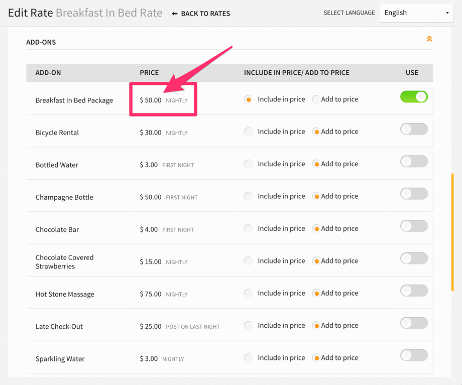 To attach the package to an add-on, scroll down to the ADD-ONS dropdown menu, select to Include in price, Add to price, or Bundle with price (see explanation above) and then turn the USE toggle ON. If you choose Include in price, the package will be included as part of the room rate; whereas, when you select Add to price, the package will be charged in addition to the room rate.