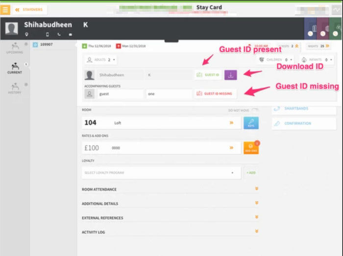 If ID collection is turned ON for Stayntouch PMS, the scan ID option will be visible in the reservation stay card.