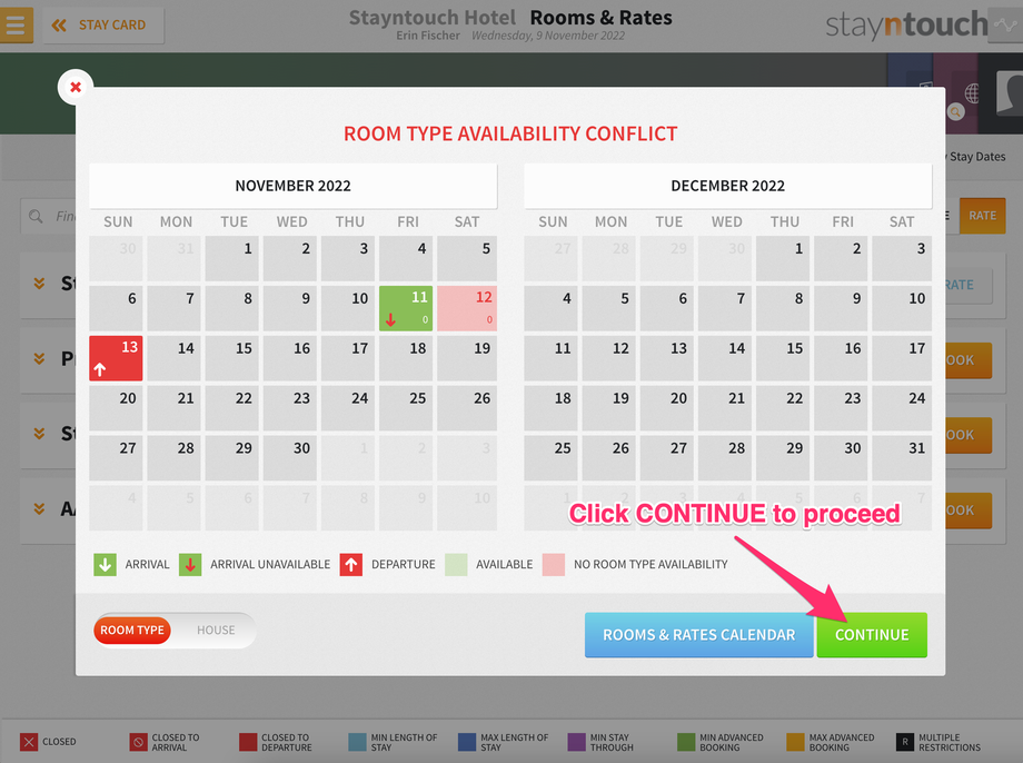 4. You'll then get a ROOM TYPE AVAILABILITY CONFLICT message. Click CONTINUE to proceed.