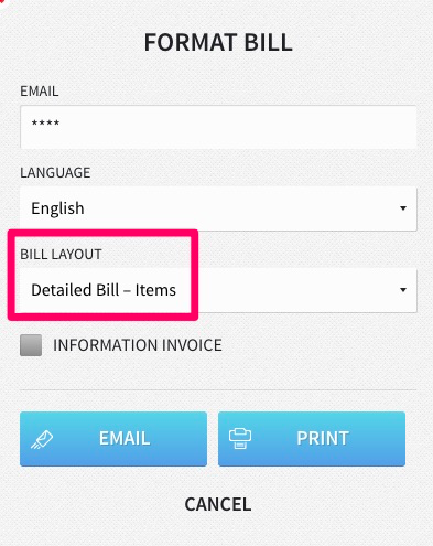 To display the name of individual items on a bill, hotels should select the Detailed Bill – Items option on the FORMAT BILL pop-up that appears when emailing or printing an invoice.