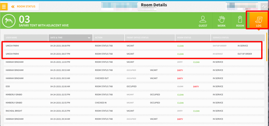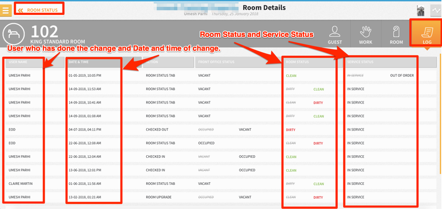 To see the audit trail or a log of the changes for a room, navigate to Housekeeping > Room Status > Select Room > Click on the LOG tab. This will list all major changes that have taken place for this room.