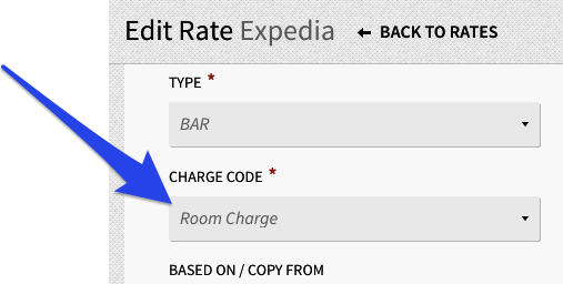 2. Create another Room Charge charge code by mirroring the parameters from your existing Room Charge charge code, with the exception of the Tax Charge. You can do so from Settings > Rates > Rates > Edit the rate code you do not want to not post tax. Then, select the newly created Room Charge code from Step 1 above.