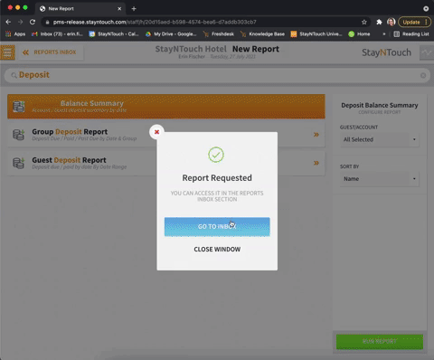 The Deposit Balance Summary Report allows you to filter by GUEST/ACCOUNT and SORT BY. Upon selecting RUN REPORT, your report will be generated in the REPORTS INBOX.