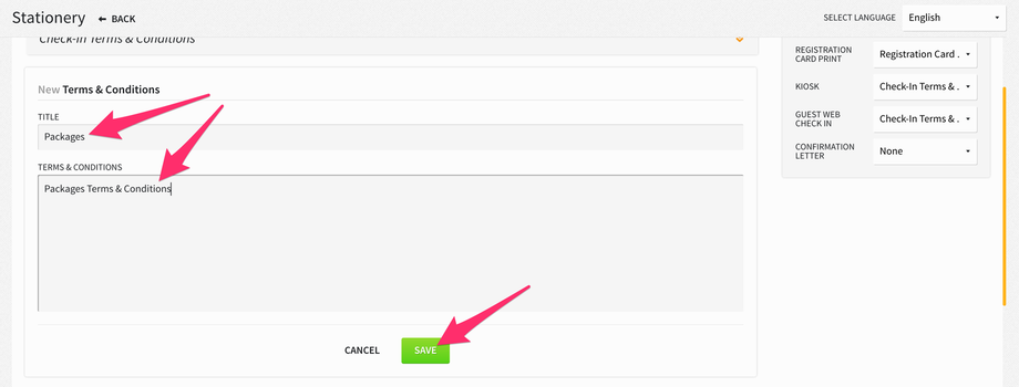 To assign custom Terms & Conditions to the stationery section of your choice, navigate to Settings > Hotel & Staff > Stationery > Terms & Conditions > +ADD NEW to first create the new Terms & Conditions.