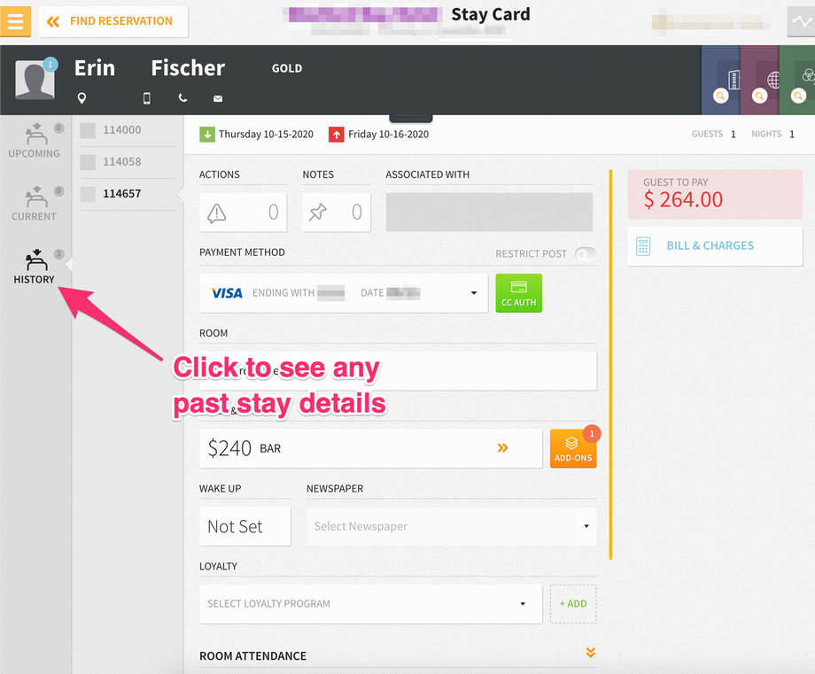 You should see the number of past arrivals for a guest when booking a reservation. Once you have booked a reservation, the guest name and details will be stored as indicated in the screenshot below.