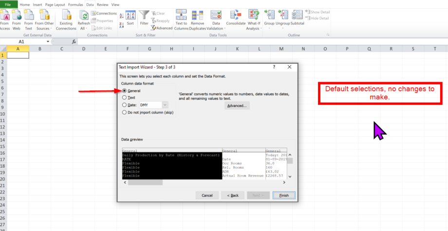 Microsoft Excel does not recognize UTF-8 characters set in a CSV file when opened by double clicking. This has nothing to do with Stayntouch PMS's code, as it supports UTF-8, and other programs like Google Sheets or Notepad are able to recognize the UTF-8 coding. It is just that Excel is unable to recognize UTF-8 characters. However, there is an alternate method to open the CSV file in Excel so that it supports UTF-8 characters. If the file is imported into Excel using the Excel's Import Wizard, then Excel recognizes the UTF-8 characters. To do so, open Excel first, choose From Text from the Data menu, then select the CSV file and import. Follow the prompts as per screenshots below: