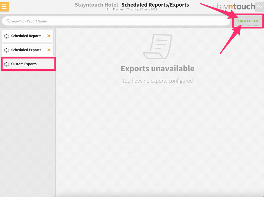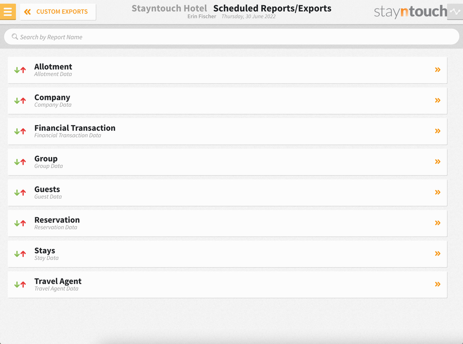 You create customized exports in Stayntouch PMS from Reports > Schedule a Report/Export > Custom Exports. Please note, in order for a user to have access to custom exports, they need to be assigned the Export Reports permission from Settings > Hotel & Staff > Permissions.