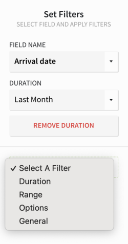 Duration filters are available for fields that represent a date range filter. If you choose to filter by Duration, you will be asked to select a field under FIELD NAME and then a DURATION.