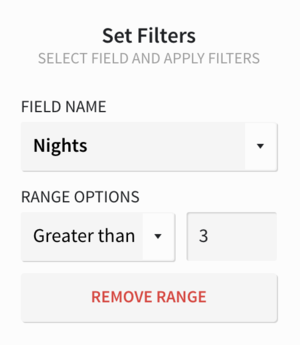 Range filters are available for fields that represent values. If you select Range, you will need to enter a FIELD NAME and RANGE OPTIONS.
