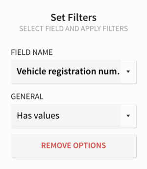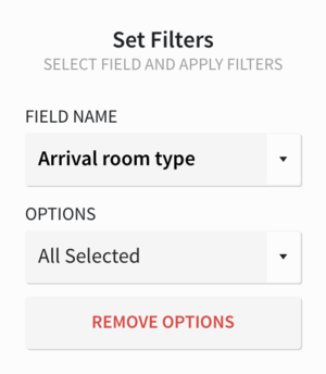 Options filters are available for fields where specific codes/options are configured for the property, and Stayntouch PMS will list all configured options for the property to be selected as a filter. Selecting Options will also prompt you to select a FIELD NAME and choose the desired filter options from the OPTIONS dropdown menu.