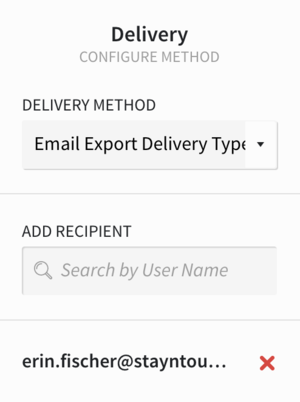 - Email Export Delivery Type: Enter an email address to which to send the export from the ADD RECIPIENT field. Type the email address. Pause. Then hit enter. Email addresses will then appear as illustrated in the below example.