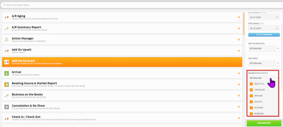 Furthermore, please note, in the report filters, the default RESERVATION STATUS is All Selected, which means the report will show reservations that are CANCELLED, NO SHOW, IN HOUSE, DUE OUT, etc. Please select the appropriate RESERVATION STATUS based on what you need. There is also a SORT BY filter below RESERVATION STATUS, which you can use to sort the report by Name or Room.