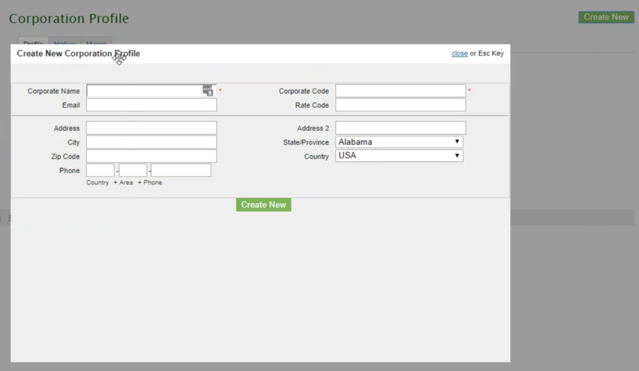 Please note, this information must be the same as entered in Stayntouch PMS, and the Corporate Code entered here should match the CORPORATE ID in Stayntouch PMS. After you have entered the information exactly as in Stayntouch PMS, select Create New to save your changes in Windsurfer.