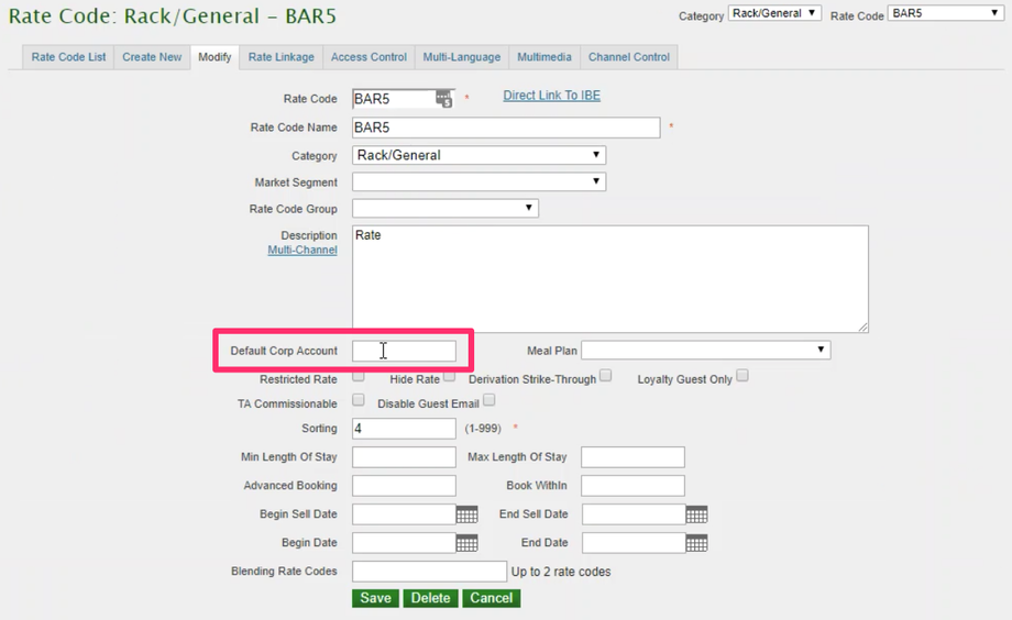 Once you have selected a rate from your list of rate codes, enter the same Corporate Code/CORPORATE ID as mentioned above under Default Corp Account. Upon entering this code, select Save, and now as reservations get booked, the data that comes from the Default Corp Account will always pull over and link to Stayntouch PMS.