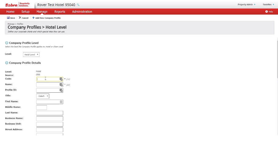 Upon saving this information, you will then navigate to SynXis to enter the same information. First navigate to Manage > Profiles > Company Profile > + Add New Company Profile and enter the information as illustrated below.
