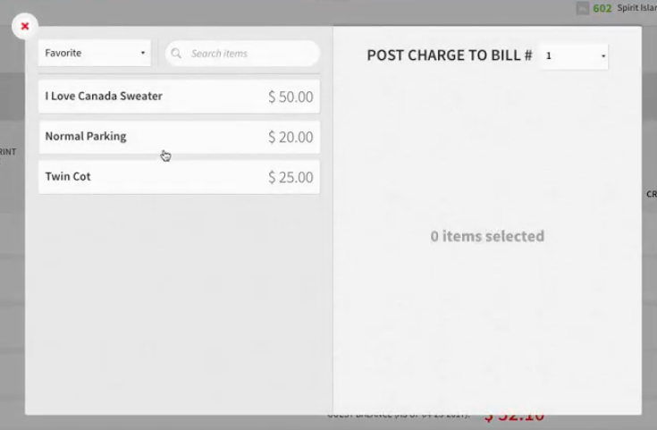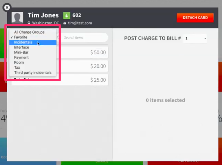 When you click on the reservation, you will be able to post charges to the guest bill. You can view different charge groups by clicking the dropdown menu.
