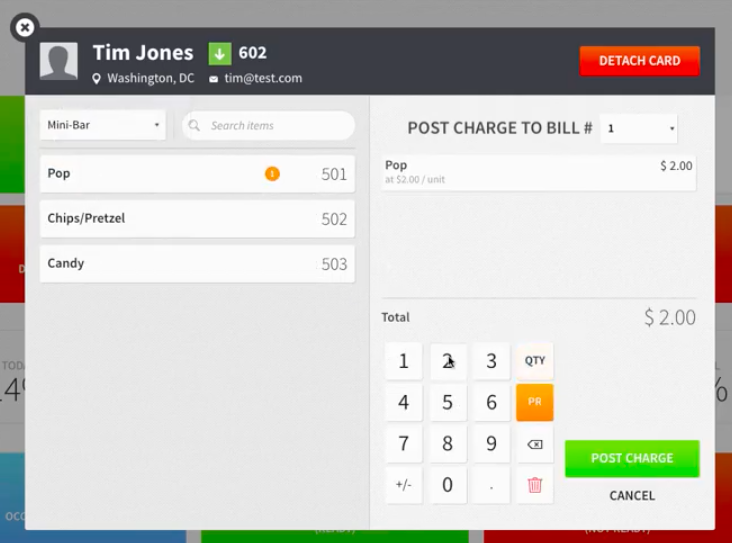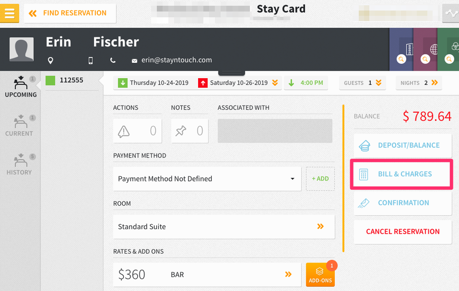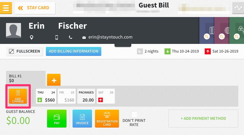The other option for posting charges is to open the guest stay card and post charges from there. Once on the stay card, navigate to BILL & CHARGES and select the orange ADD CHARGE button.