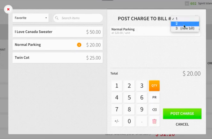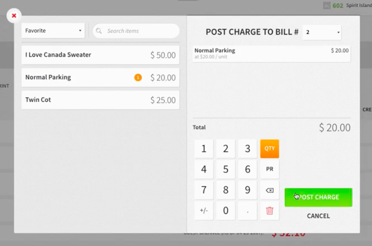 Once you have selected a charge group, you can select a charge, indicate the quantity, choose which bill to route charges to, and then select POST CHARGE.