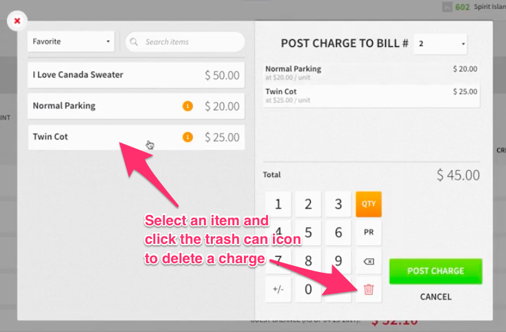 Please note, you can also delete charges by selecting an item and clicking the trash can icon next to the POST CHARGE button (if the necessary permissions for posting charges have been granted from Settings > Hotel & Staff > Permissions).