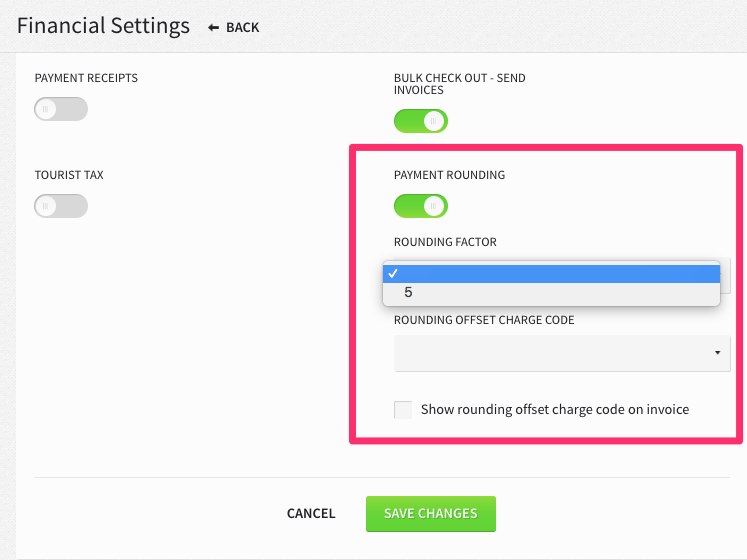 We now support cash payment rounding where small denominations (i.e., 1 and 2 cents) are no longer in circulation. Please note, only invoice totals will be rounded, not individual charge code amounts. This feature can be enabled from Settings > Financials > Financial Settings, and once enabled, a ROUNDING FACTOR of 5 can be set. You also have the option to set a ROUNDING OFFSET CHARGE CODE on the invoice if desired. To show this on the invoice, select the checkbox for Show rounding offset charge code on invoice. If left unselected, the ROUNDING OFFSET CHARGE CODE will not be shown on the invoice.