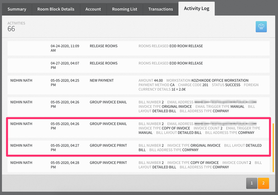 The Stay Card, House Account, and Group Activity Logs now record any attempts to print or email an invoice and re-print or re-email a copy of an invoice.