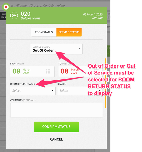When setting a room Out of Order/Out of Service, you can now select a ROOM RETURN STATUS from a dropdown menu containing your hotel’s configured housekeeping statuses. Once the room is no longer Out of Order/Out of Service, the room status of the room will be set according to the housekeeping return status.