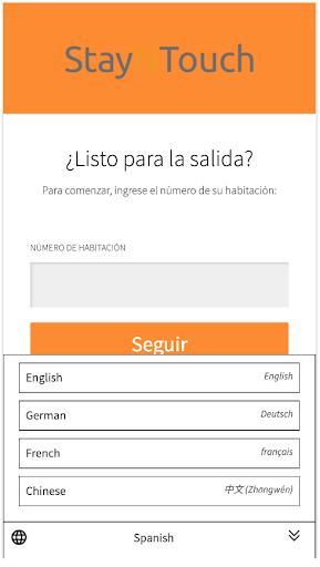 The home screen now displays in the default display language for Stayntouch Guest Mobility. From this screen, guests can change the pre-selected language. The selected language will display all text/labels from the configured JSON file in Settings > Guest Mobility > Translations for the related check-out message