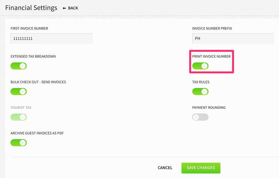 If the PRINT INVOICE NUMBER toggle is turned ON from Settings > Financials > Financial Settings, Stayntouch PMS will display all invoice types (Information Invoice, ProForma Invoice, Final Invoice, etc.). If the toggle is turned OFF, Stayntouch PMS will not display these invoices.