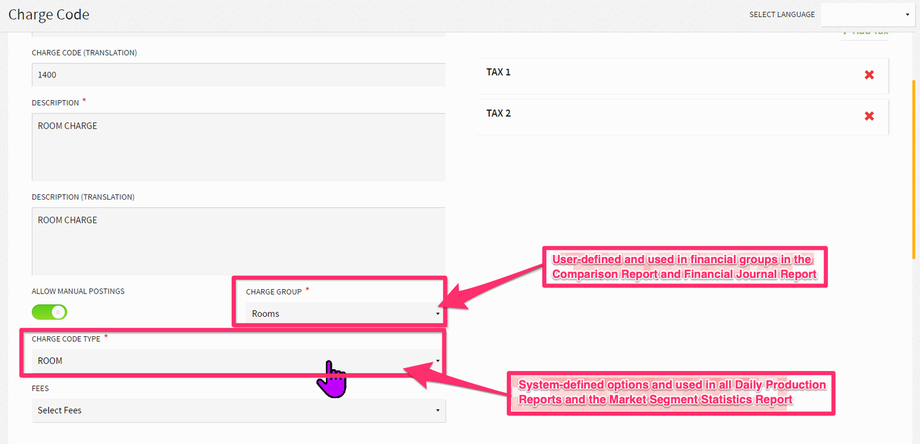 Charge Code Type is system-defined, which means it is built into the code and cannot be changed by anyone. This is used in the Daily Production Reports and Market Segment Statistics Report. In these reports, when you see Room Revenue, it includes the revenue from charge codes with a Charge Code Type of ROOM. When you see Other Revenue, it includes the revenue from charge codes that have a Charge Code Type of OTHER. And so on. Therefore, the ADR will only consider revenue from the Charge Code Type of ROOM.
