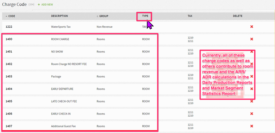 As illustrated in the screenshot below, the below charge codes and others contribute to room revenue and ARR/ADR calculations in the Daily Production Reports and Market Segment Statistics Report.