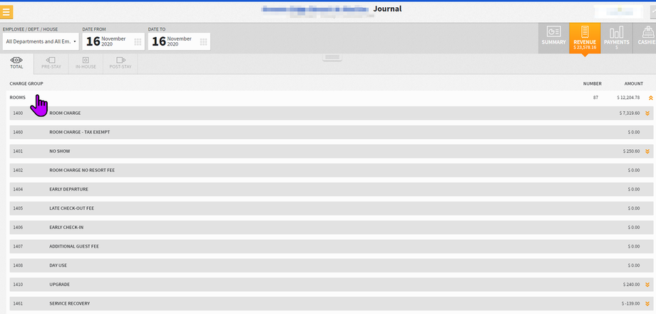 Stayntouch PMS Room Revenue Calculated According to Charge Code Configuration