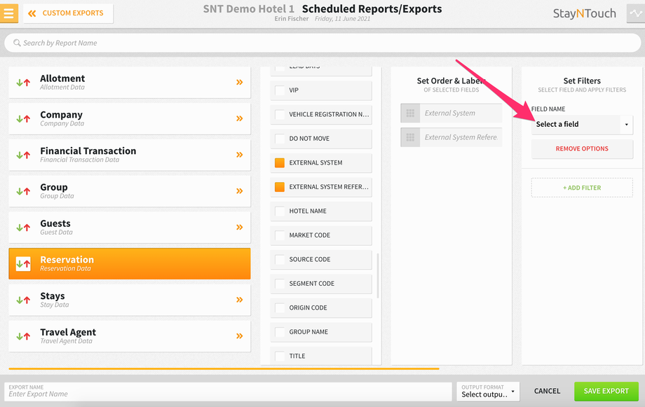 Upon generating the Reservation and Stays dataspaces from Reports > Schedule a Report/Export > Custom Exports > + NEW EXPORT, you’ll now see that we’ve added fields for EXTERNAL SYSTEM and EXTERNAL SYSTEM REFERENCE to the Select Fields section, which will display the primary external reference from the system a reservation originates from. Furthermore, from the Set Filters section, if you select +ADD FILTER > Options, you can filter the exports by an External System.