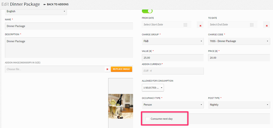 In the screenshot below, Consume next day is not selected in add-on setup, and the add-on is not included in the rate.